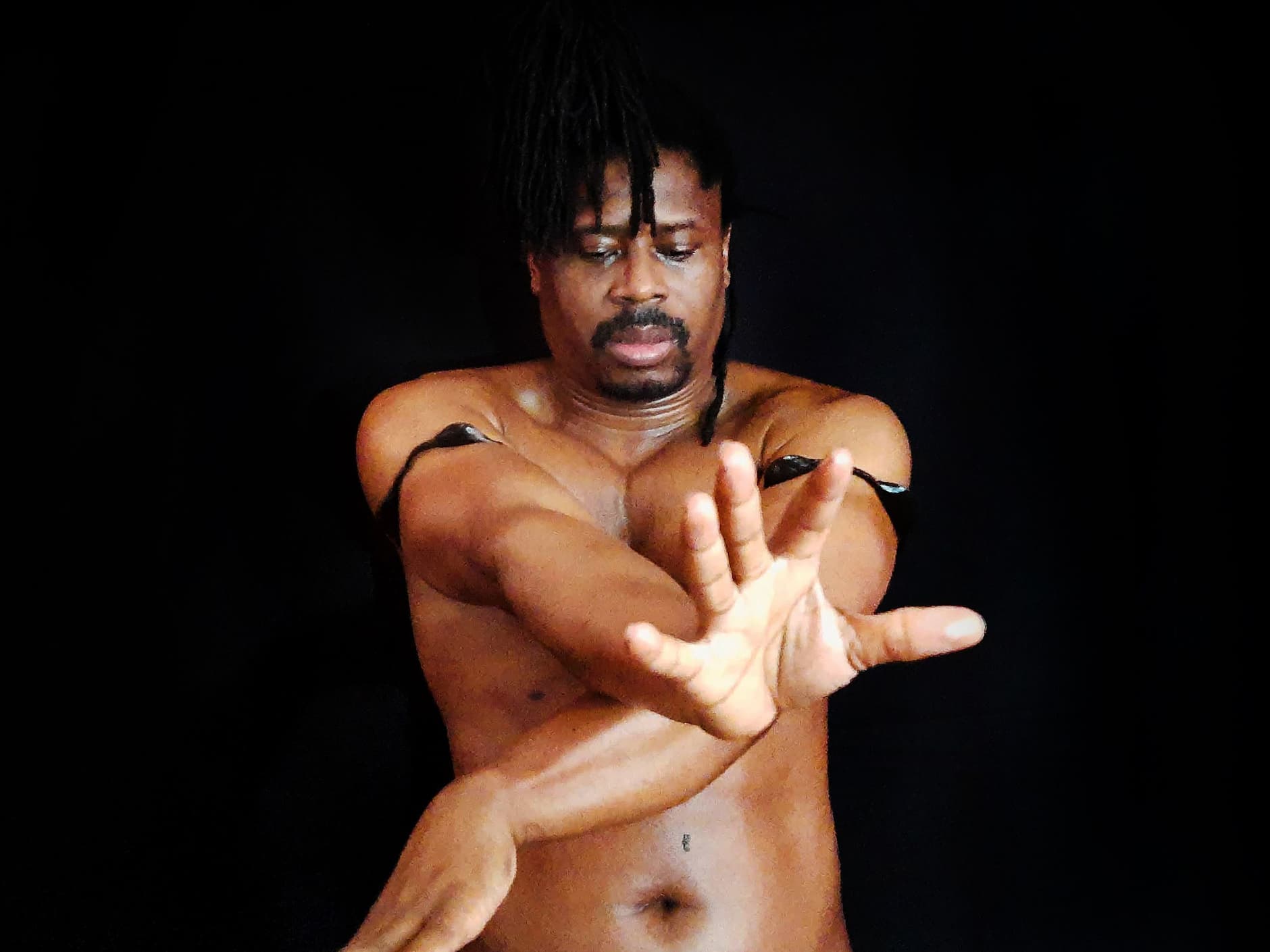 Dans mon appartenance ethnique - Éwé - la formation de la polyrythmie musicale englobe non seulement les aspects sonores mais aussi le mouvement, chaque danseur agissant comme une couche supplémentaire du polyrythme musical. Le polycentrisme s'entremêle dans ce jeu où l'on devient un flux de motifs comme s'ils avaient une vie propre. La performance plonge dans cette relation intime avec de multiples vibrations, ondes et fréquences comme la polyrythmie-graphie. À travers elle, je sculpte le son, je deviens rythme et je mâche une conception décolonialisée de la chorégraphie. Photo Christiane da Cunha